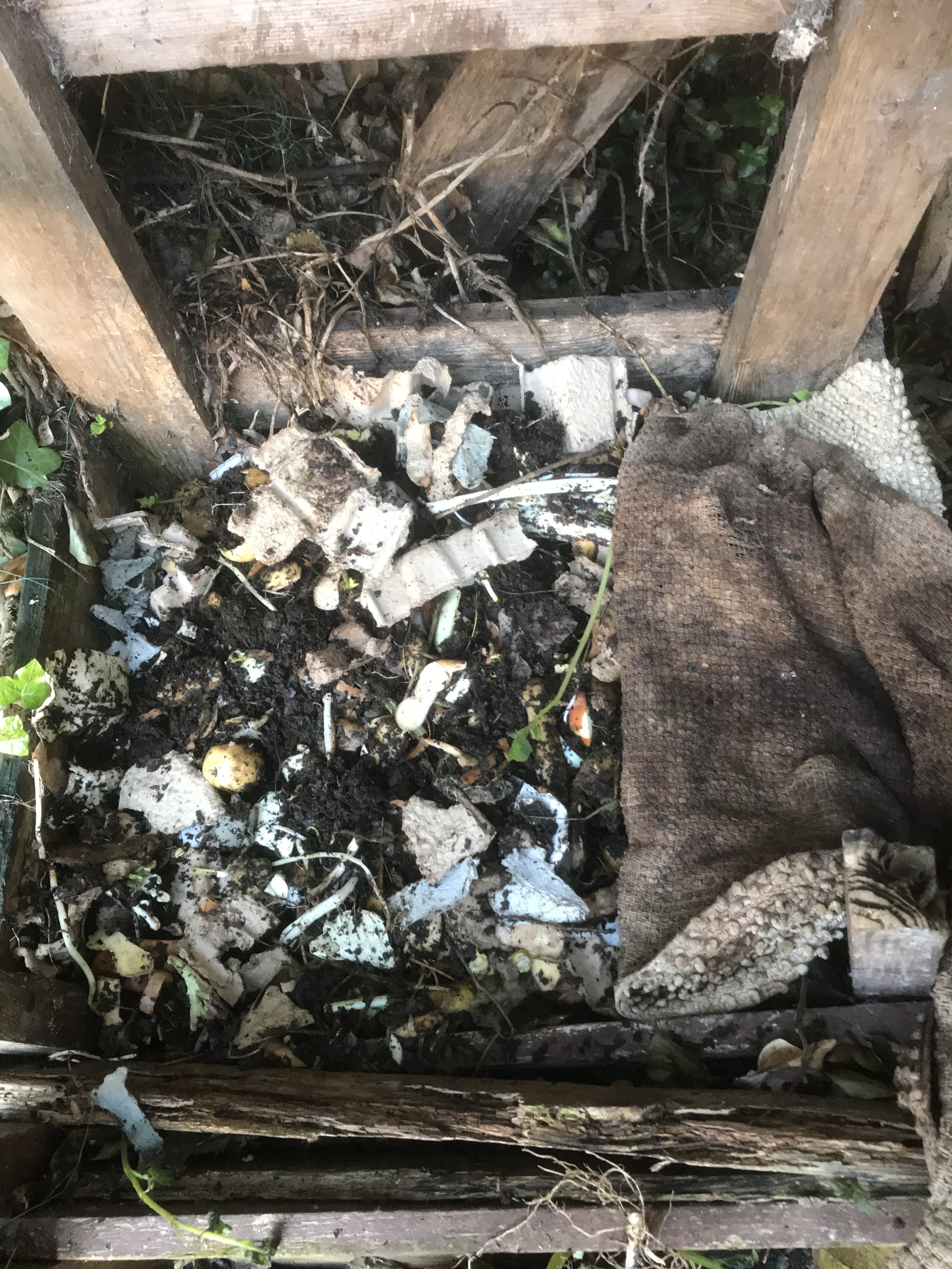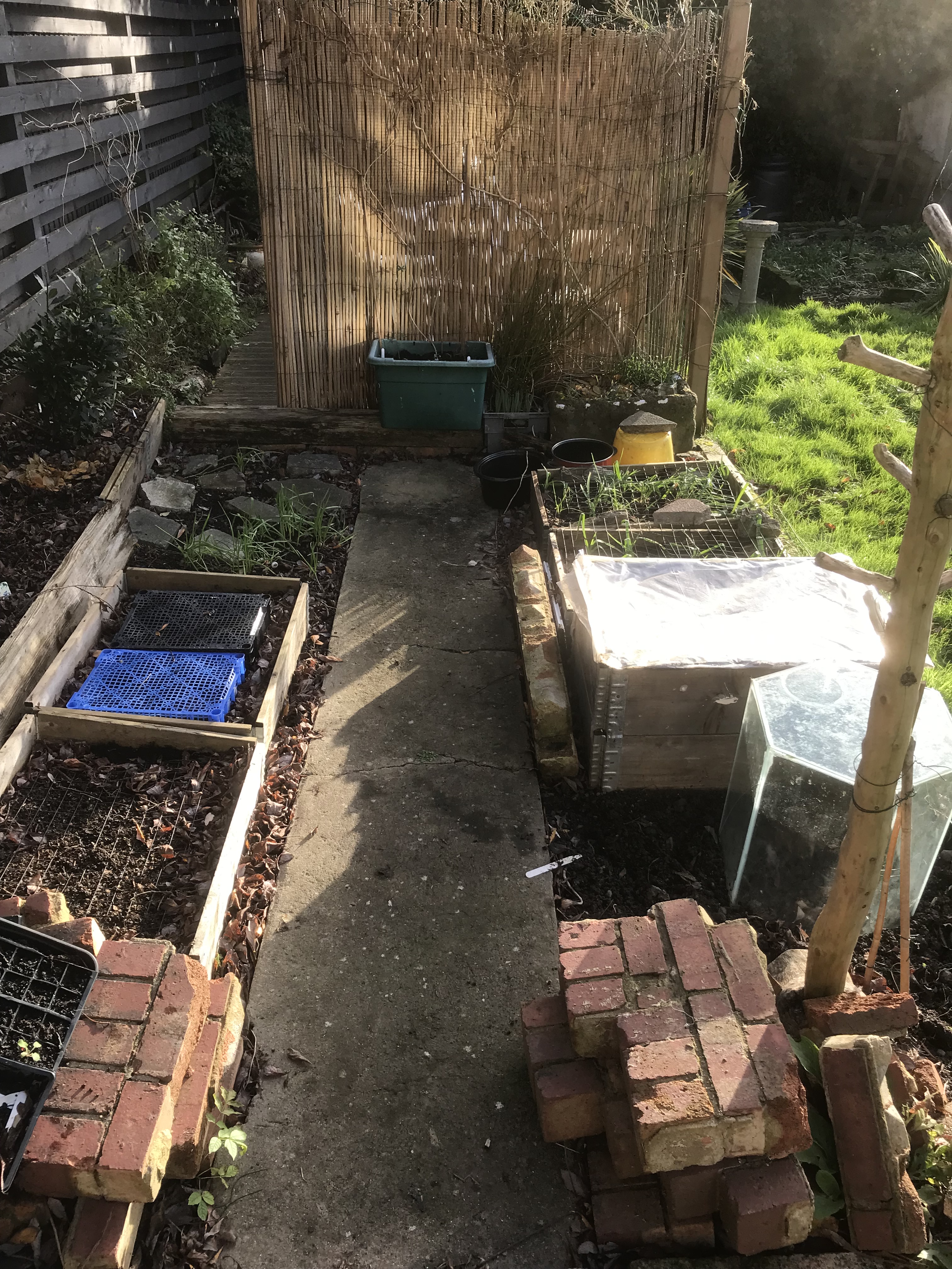 There’s not much to see in the garden at the moment but the compost heap is still composting, the fish are swimming at the bottom of the pond and there’s protection all around the garden for the forthcoming cold snap(s). Apart from the odd bit of tidying up we haven’t done that much apart from visiting the compost heap with the odd teabag and veg peelings. When we can remember we always stick a small layer of already made compost on the heap from the dalek bin beside it which will hopefully help the whole process.