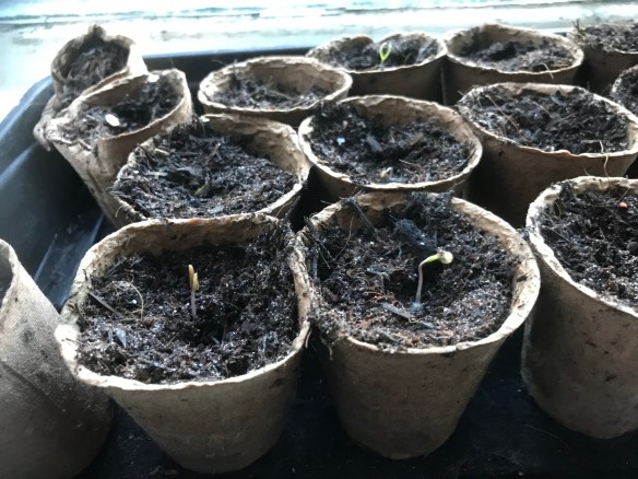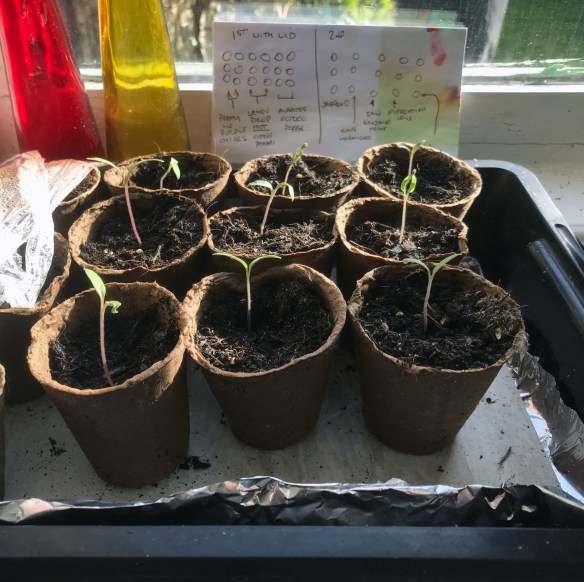 And the Tomatoes which were started in an uncovered tray are slowly starting to grow. These above are the (first vertical row) San Marzano (second row) Florentino which we are sure we obtained from a Glengall Wharf Gardens SE15 seed swap from two or three years back and (third row) a Cherry Tomato called Cerise from those 6 in 1 vegetable pack from Ebay. Springtime we’re waiting for you to spring!