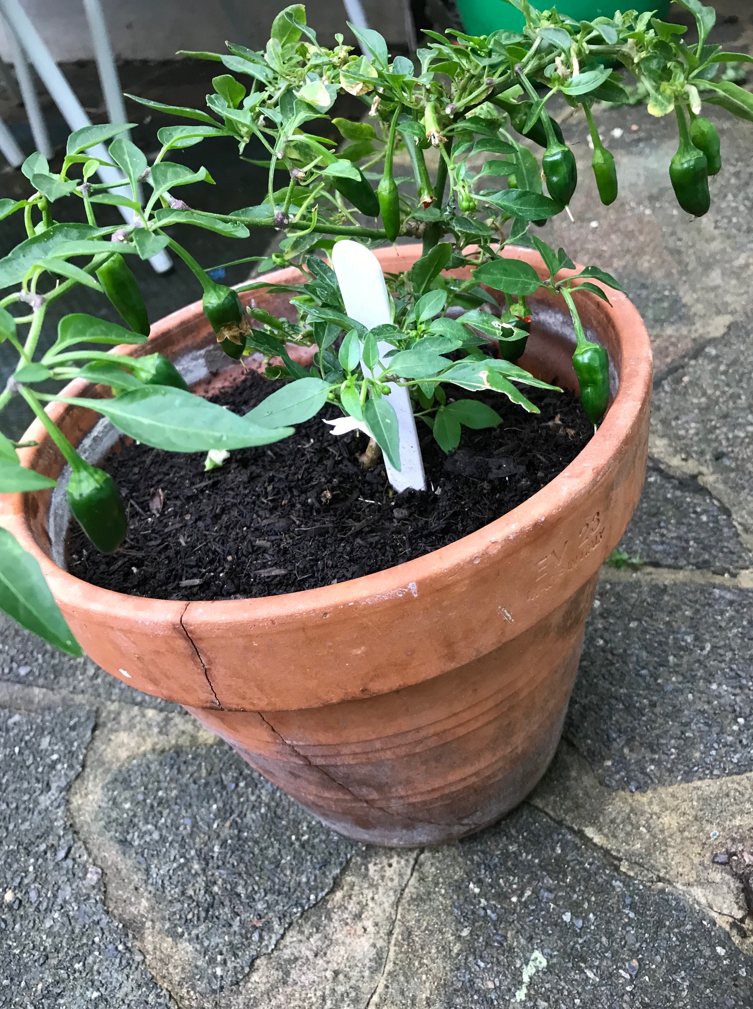 And below is the plant this year that’s kept on the kitchen windowsill. Do bring them in over the winter, they won’t look they are doing much but they’ll reward you again and again! Look at the amount of chillies we have on it and warning, apache is a hot one!