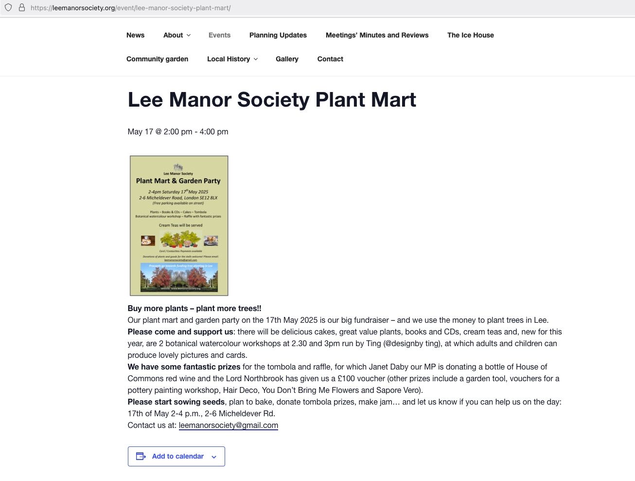 Thanks to Penny Golightly, here’s news of a great little plant mart in Lee next Saturday May 17th from 2-4 p.m. outside 2-6 Micheldever Road, Lee SE12 8LX and the event is a fundraiser to get money to plant more trees in the area. There’ll be a wide range of plants for sale at a good price as well as lots of other stuff (cakes, books and CDs, cream teas and 2 botanical watercolour workshops at 2.30 and 3pm). Looks great! Cheers Penny!