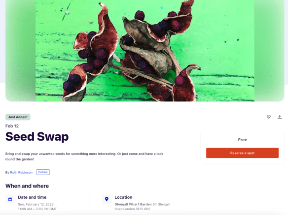 A couple of events to stick in the old diary. The first is a Seed Swap in the Corbett Community Library, Torridon Road, Catford, London SE6 1RQ on Saturday 25th March 2023 from 10am to 3pm. More on the event
