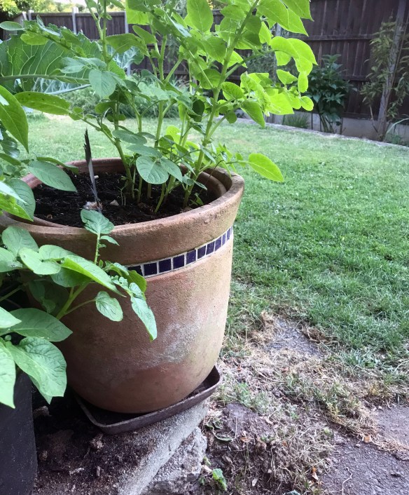 And found yesterday outside a garden wall was this nice plant pot even though it was on the heavy side and took a bit of effort to take home. As soon as we got it in the garden we plonked in a smaller pot which has a potato plant growing in it and it looks like they were made for each other. Keep ’em peeled!