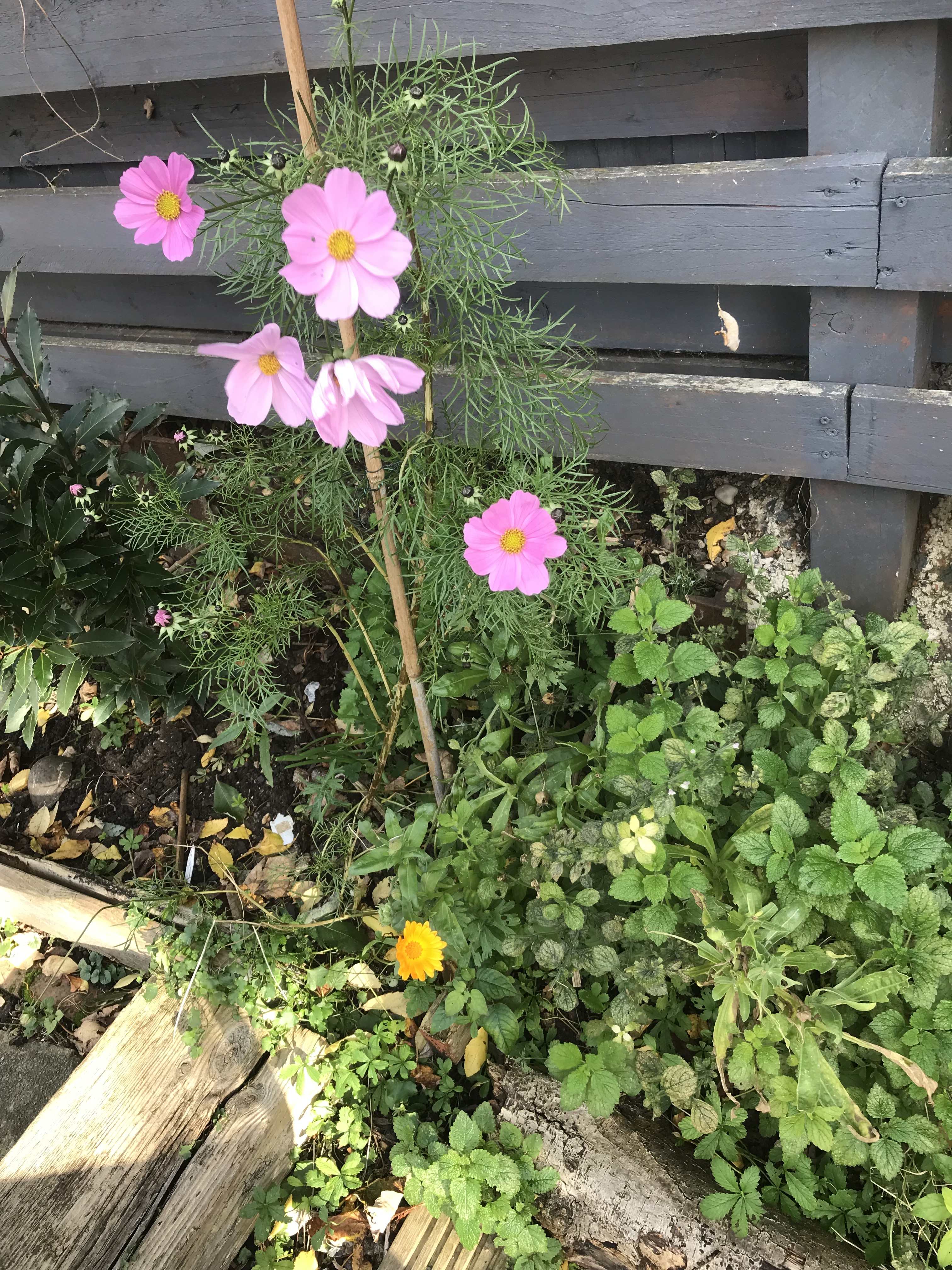 We’ll still do the old council mowing trick of “two cuts in one” in the spring. We go over the lawn with the mover blades on the highest setting (giving it less of a cut). Then give it a quick rake over (even thought you may have a grass catcher on the mower) and then go over it again with the mower blade one notch lower. It takes longer but saves less effort on the blades. And can you believe the cosmos is also still going…