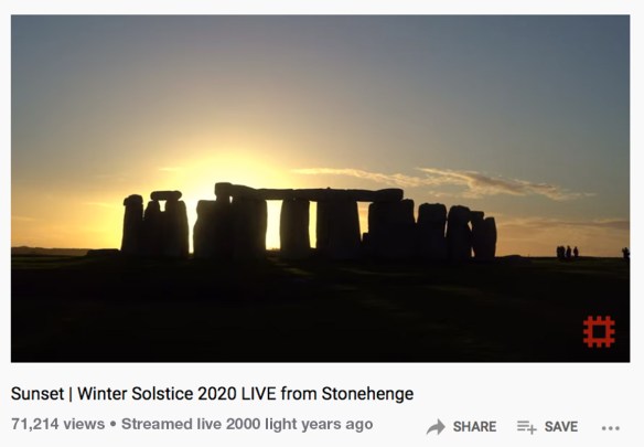 We are presently keeping ourselves amused by watching the replay of the Stonehenge Winter Solstice stream here on youtube where at the moment there’s a bunch of security guards in high visibility vests congregating in the upper right hand corner either having their own celebration or standing around a calor gas heater.