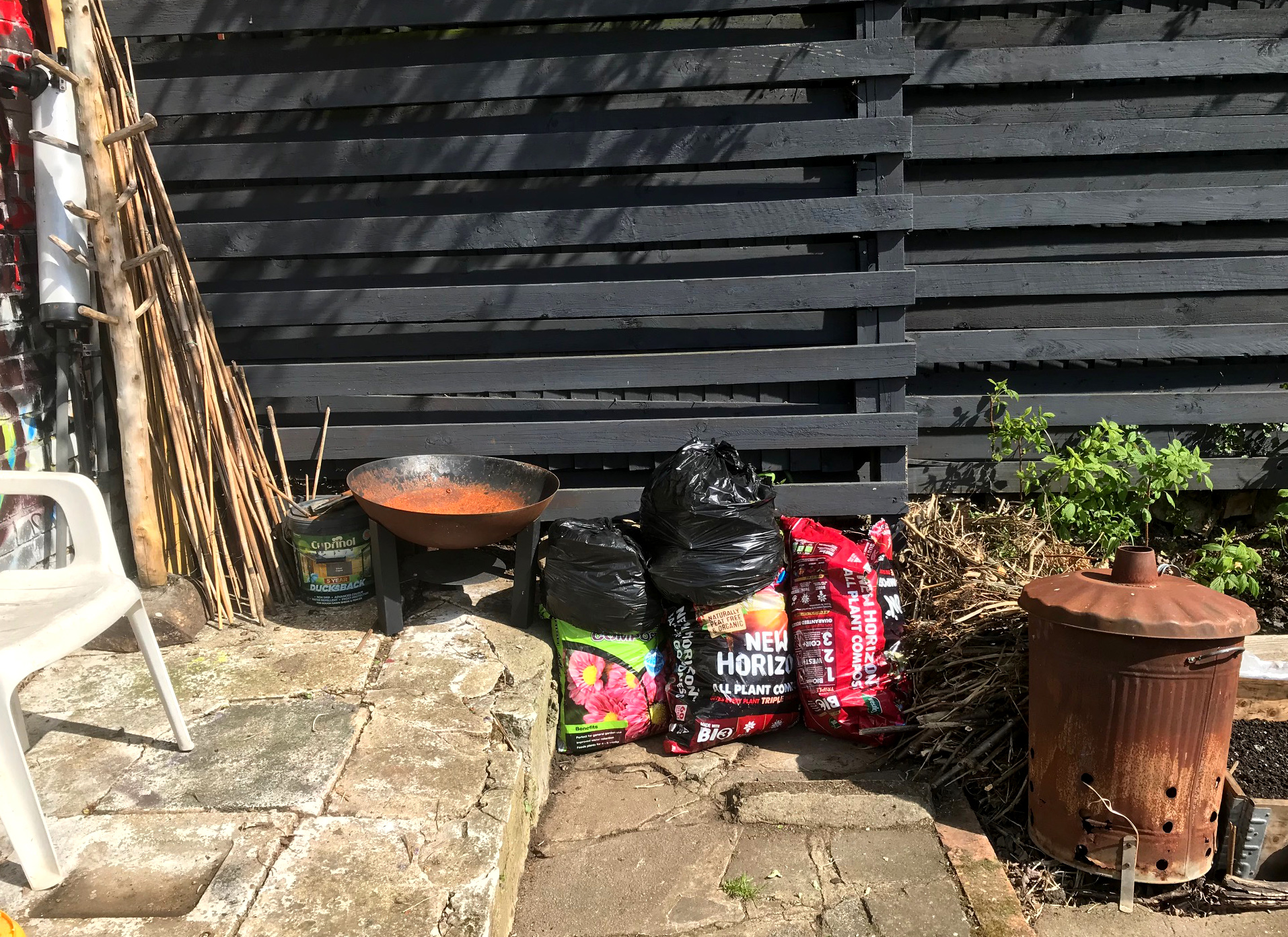 It was some bamboo canes and a couple of old Belfast sinks that saved the day at Weeds HQ last weekend. The builders are in next door and they’ve erected a 8ft high chipwood berlin wall type structure between us. To say it was initially a sight for sore eyes is an understatement so something had to be sorted.