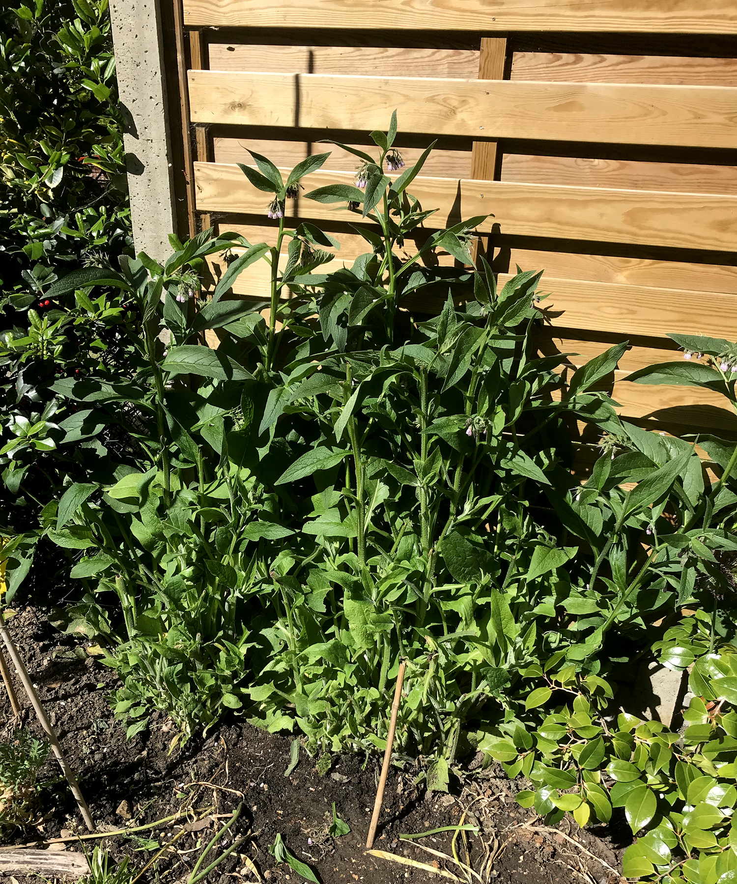 The actual plants where we’re taking the leaves from are taking a hammering at the moment (and it’s not even June!) but they don’t seem to mind. If you’re going to get some go for the “Bocking 14” variety. As the song goes: comfrey, what is it good for?