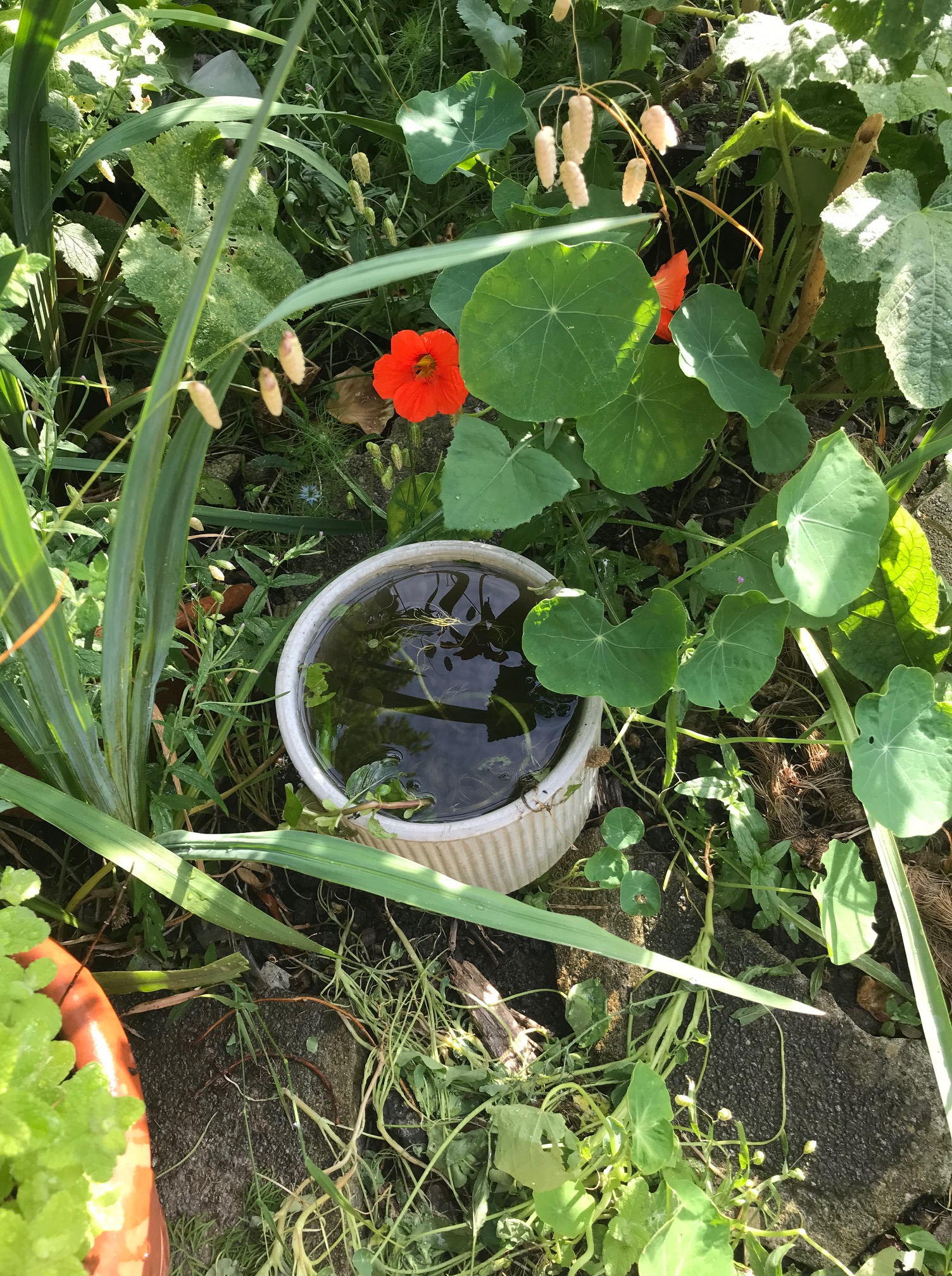 If we have to thin plants out of the pond we sometimes put them in micro ponds we’ve dug into the ground in the wild bit at the bottom of the garden. This time here’s some water mint in an old M&S plant container. Waste not want not.