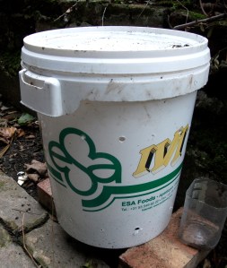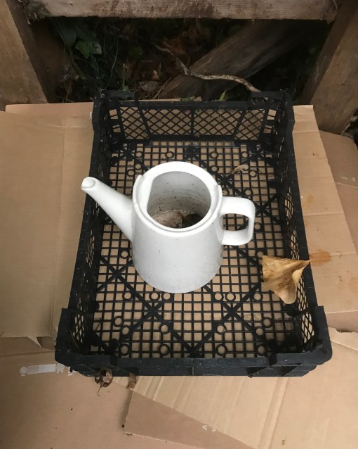 We felt sorry for the worms (who will just return to the heat of the lower part of the pile we hope) so we covered the heap with some sheets of cardboard and to hold them in place we stuck a plastic tray and a jug on top. There was no specific reason for the jug apart from it was the only thing we could get our hands on at the time. Perhaps we could start a new trend in the gardening mags of “household items on top of compost heaps”. You saw it here first!