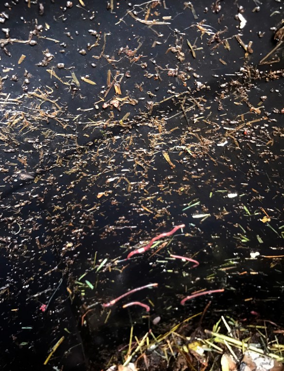 There ain’t much going on at the moment so we decided to give the heap a turn with a garden fork, not sure if it’s the right thing to do at this time of year but fork it we did. The brandling worms are still at work and the decaying waste is looking good. Work never stops for the worms (unless perhaps a giant fork appears from above).