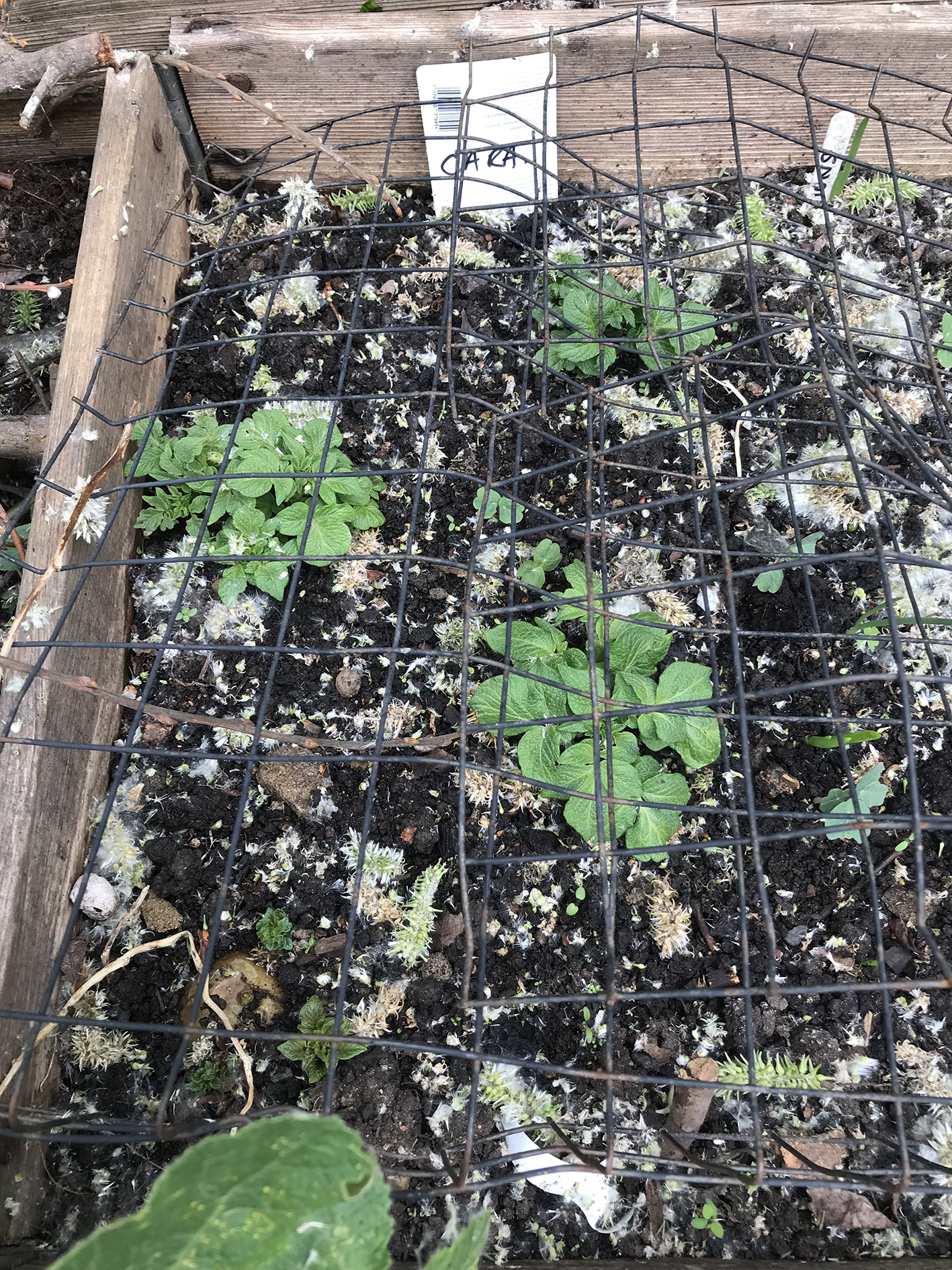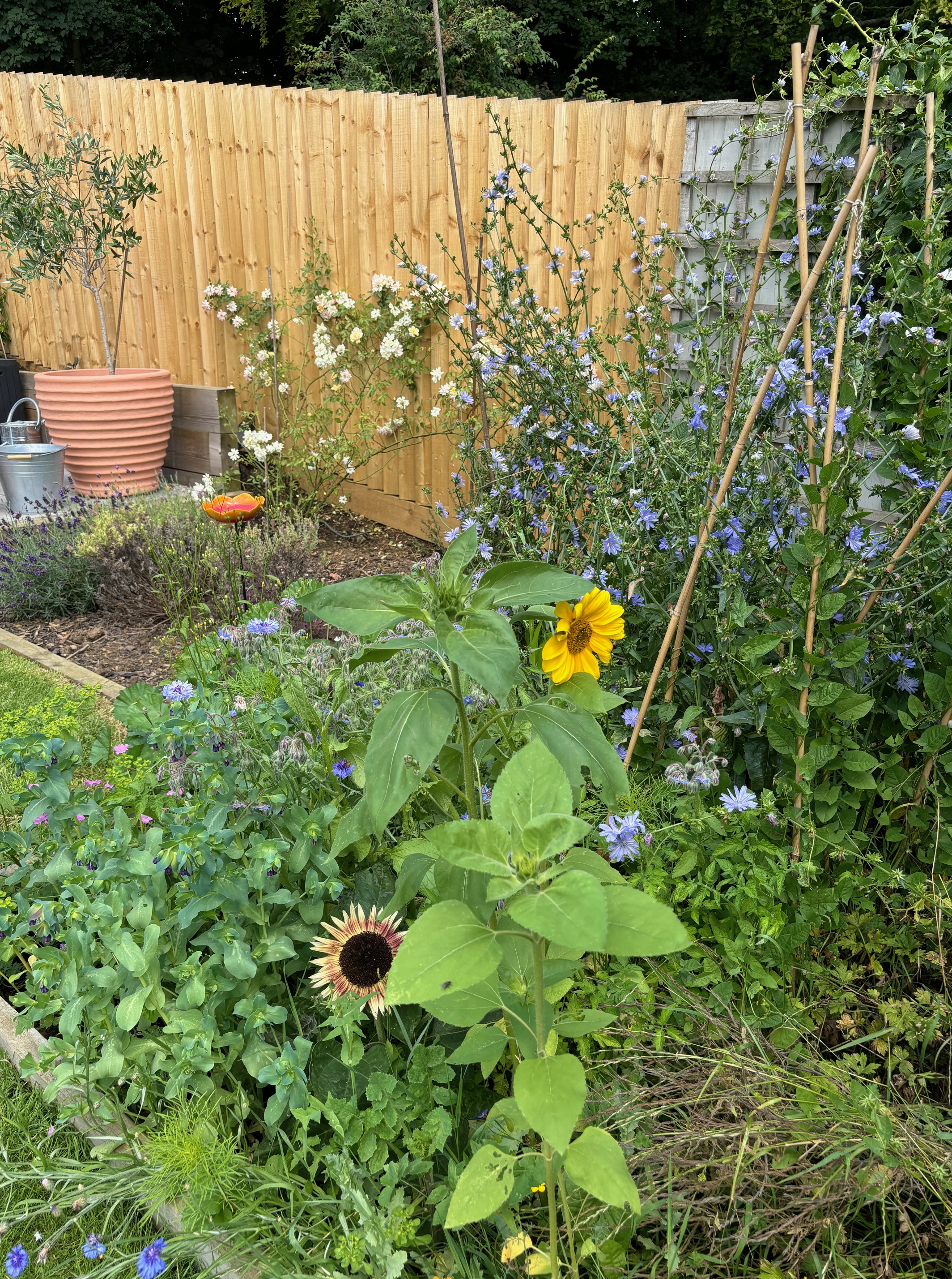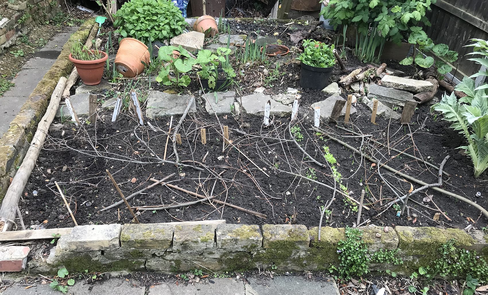 The bottom part of the garden has now vegetables starting to germinate (the sticks keep the cat out) even though the home-made plant labels have the touch of small gravestones if viewed at the right angle.