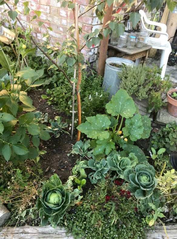 Things are looking great in the garden, the late sown Courgette/Zucchini plants are flowering and here’s one of them with a little fruit showing on the left hand side (above). In the picture is also some sort of wild geranium/pelargonium that came out of a wild flower seed mix we flung around the area beside it.