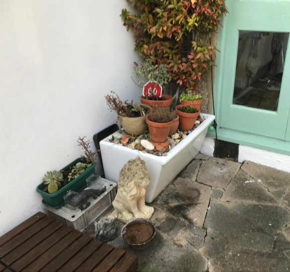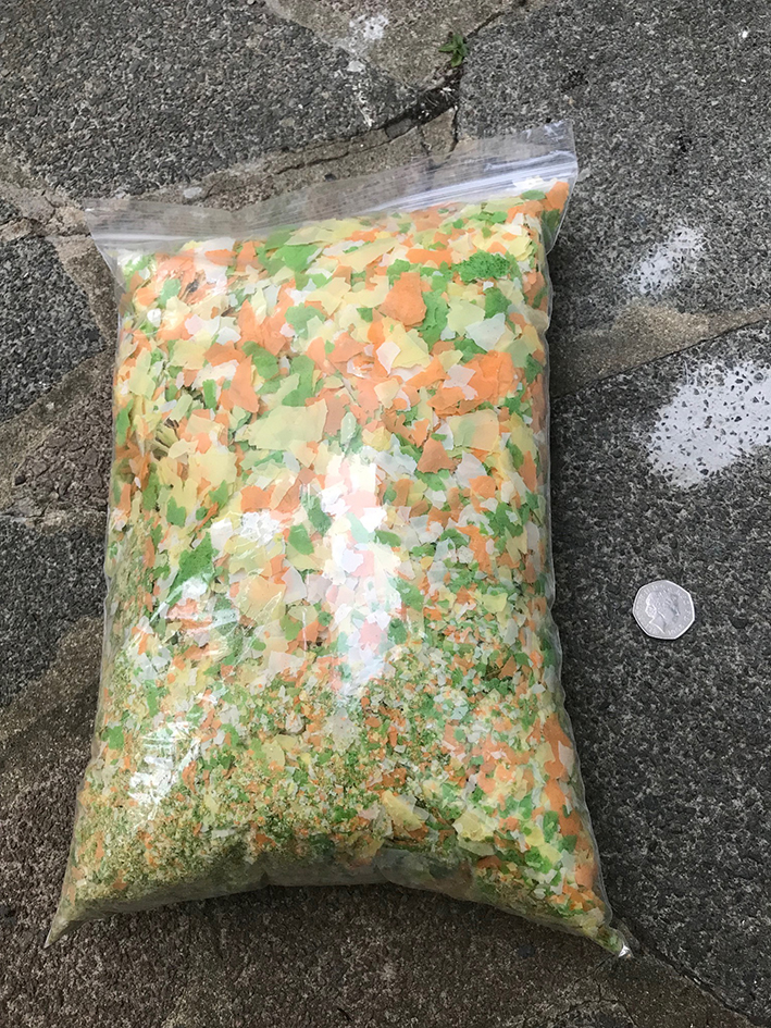 There are a couple of fruits starting to ripen on the very early sown tomato (above) we put in a broken food recycling bin that is up near the house. And (below) an ebay purchase (of £11) of fish food for the goldfish in the pond (50p for size comparison). Reckon this’ll last until the end of the decade! Does fish food have a “use by” date? Another silly question put to you by Weeds up to me knees.