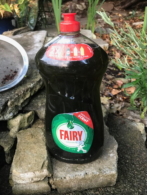 Earlier this morning we passed on another container of home made comfrey liquid to spread the love/smell/word. The container this time was a well washed out non-bio Tesco washing liquid bottle.