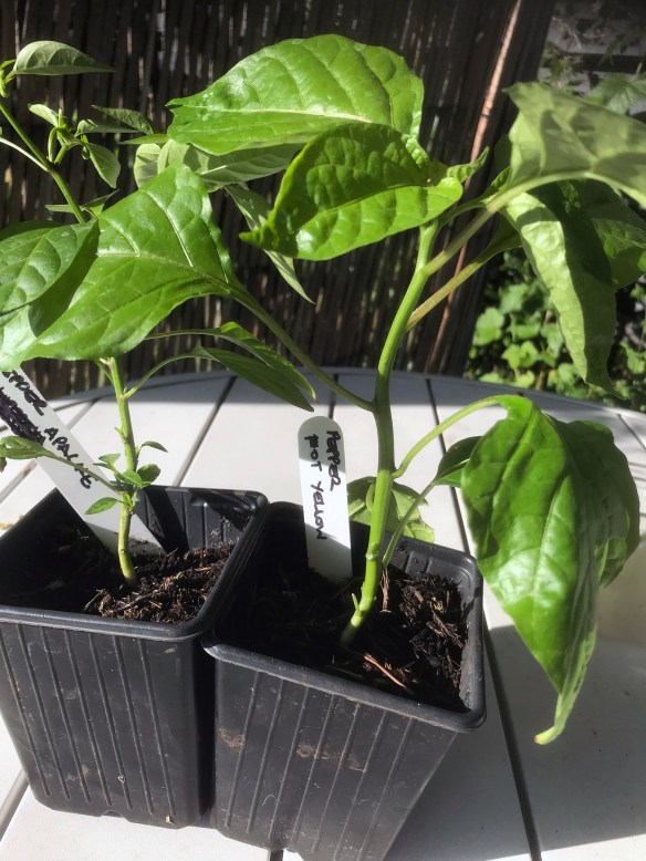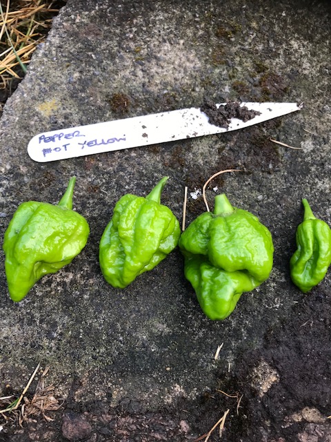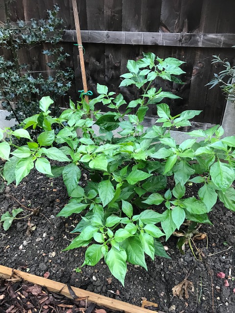 The chilli pepper we were given the other week has now got fruits (below) and we were told by the patron of said plant that she started it off very early in January. We’ll be bringing the pot in this winter and see if we can keep it going next year. Peppers and chillies are perennials so we’re told, as it says