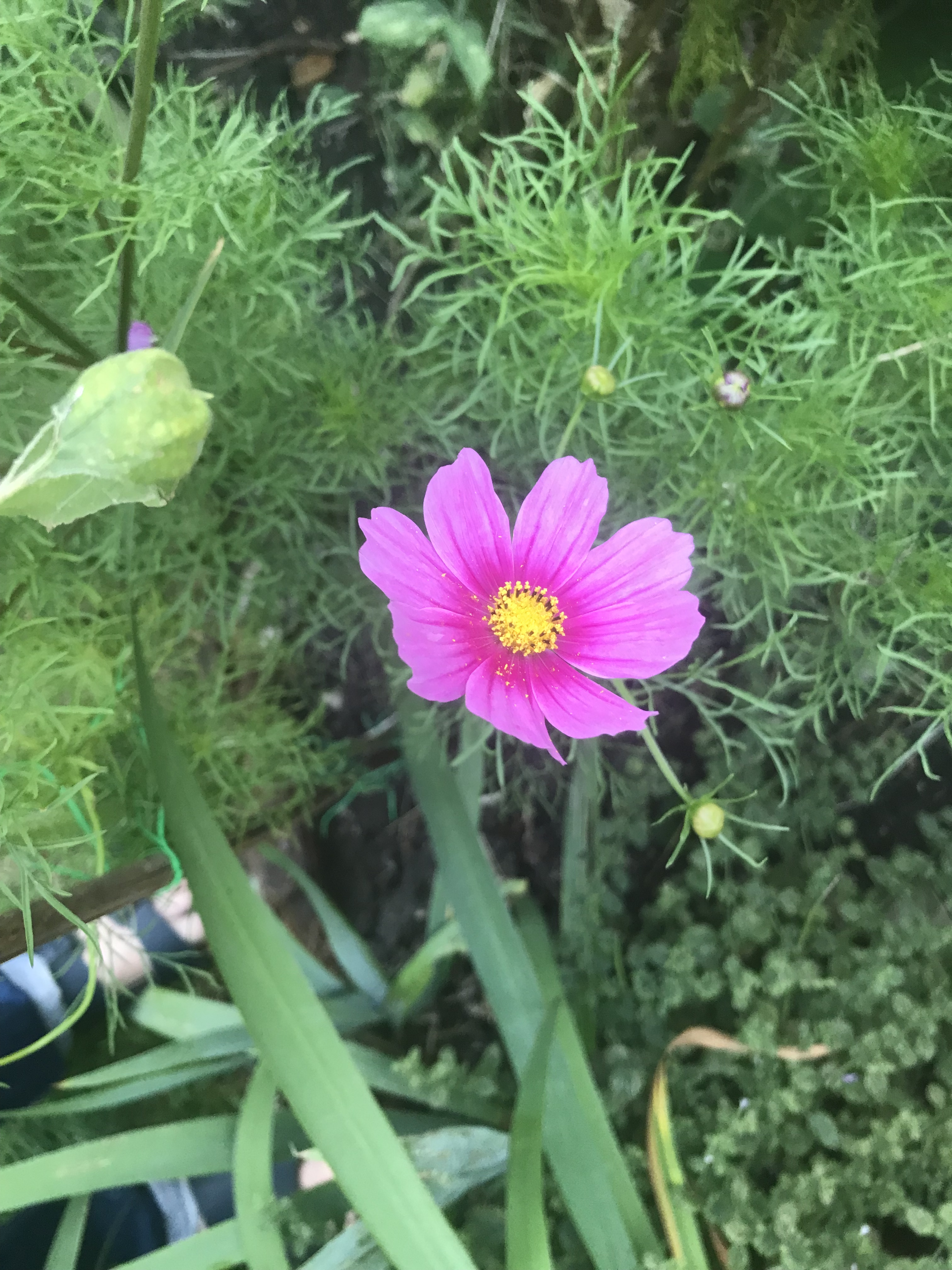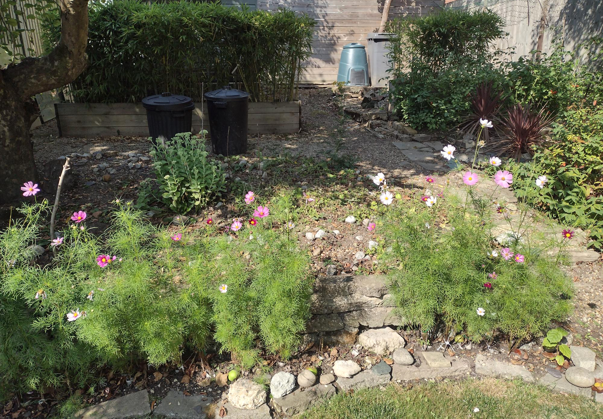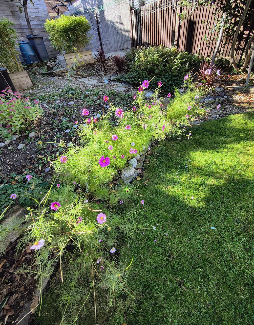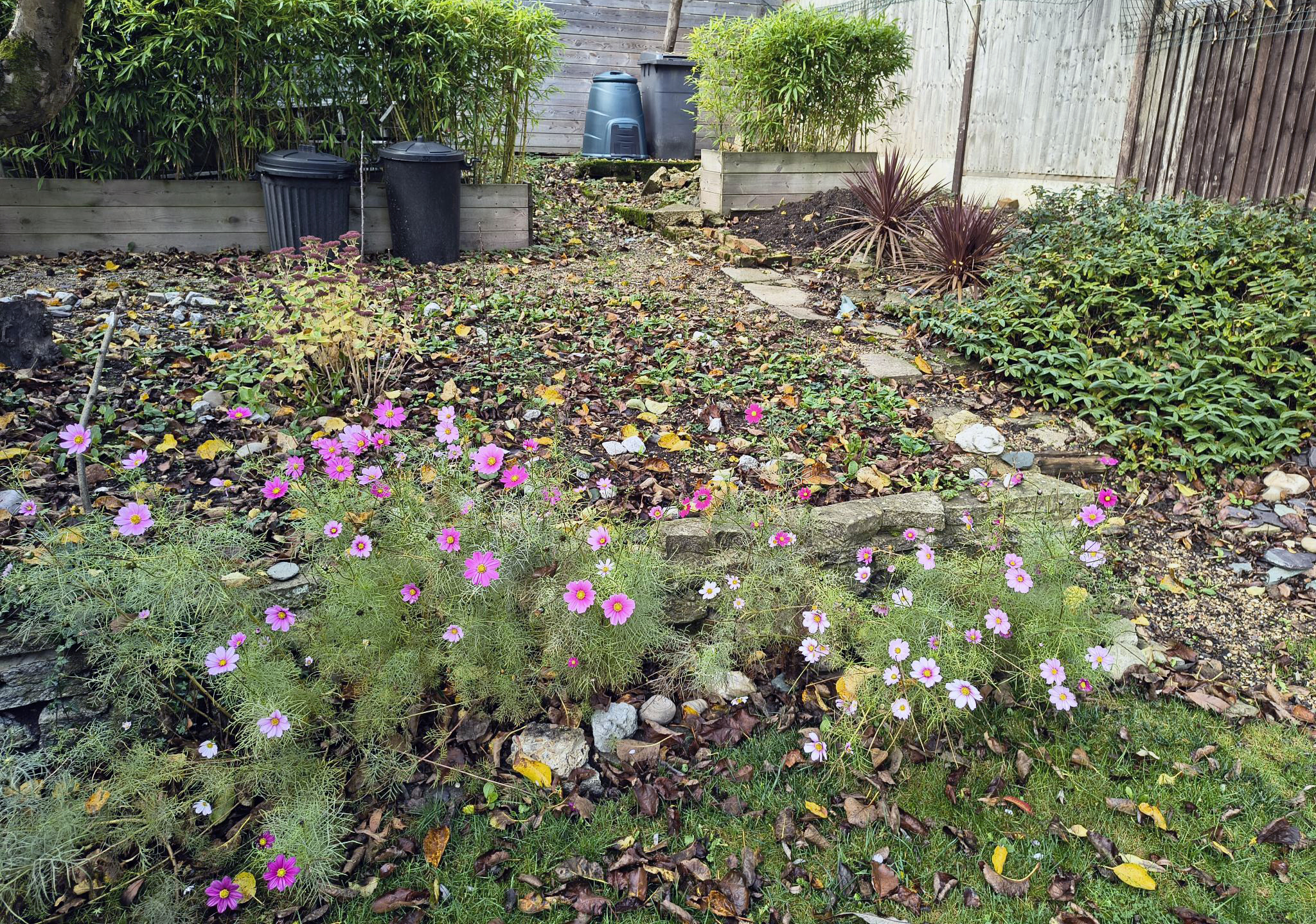 The back garden is in a bit of a mess at the moment as we haven’t been able to go out there as much as we would have liked to of late. There’s a still a couple of things that make us smile though. This morning we saw this cosmos (above), peeking through the broken paving slabs at the back of the pond after our “throw them everywhere” sowing experiments earlier this year.