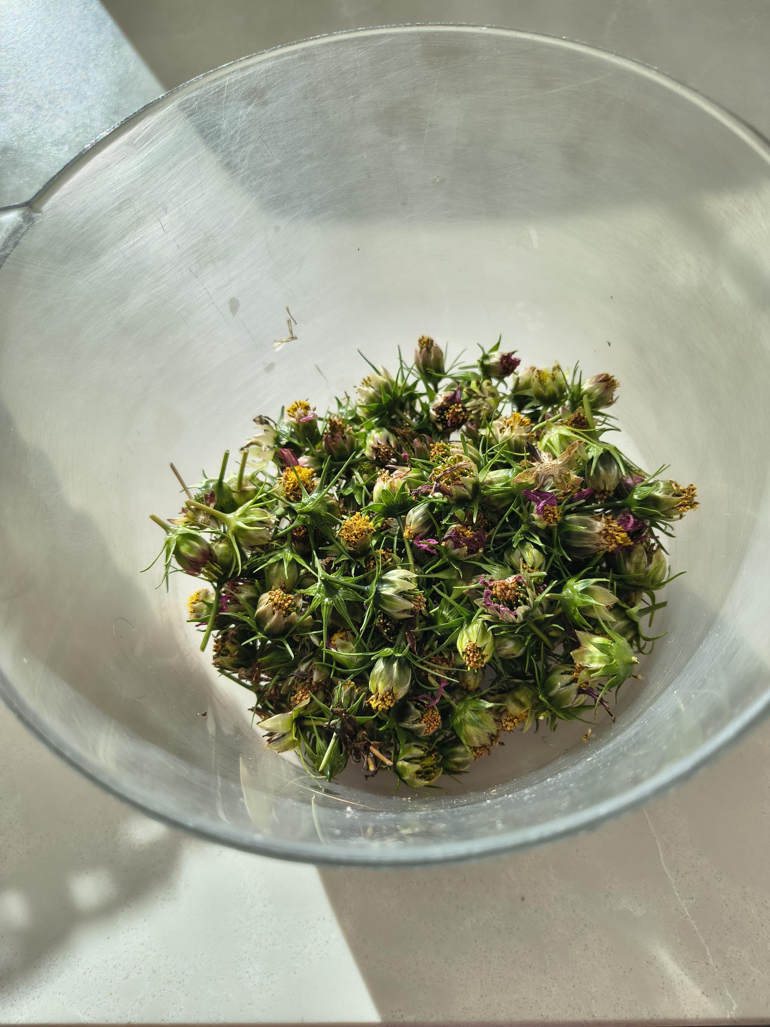 Above are the cosmos that are still flowering and looking great and below are some cosmos deadheads which’ll be used for seeds. Debby told us you don’t even need to break the seed heads up that much, just put them as they come in a seed tray in the spring. We have to deadhead ours actually, before it starts getting wet and the chance of things going mouldy on us.
