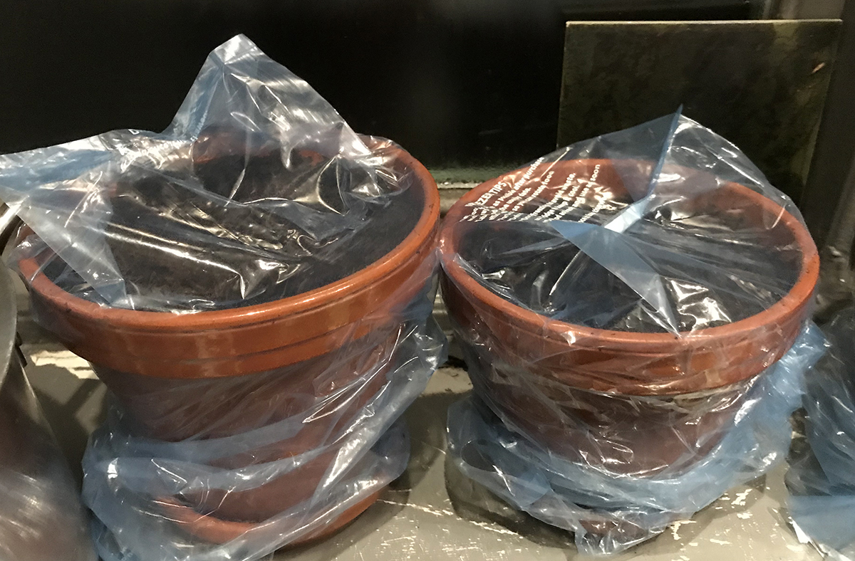The upside down terrarium/fish bowl found in the street certainly gets used in the Weeds garden, it might have been moved yesterday to cover a pepper plant that is still going strong but previous to that it was keeping a bit of sprouting ginger and some garlic seedlings warm.