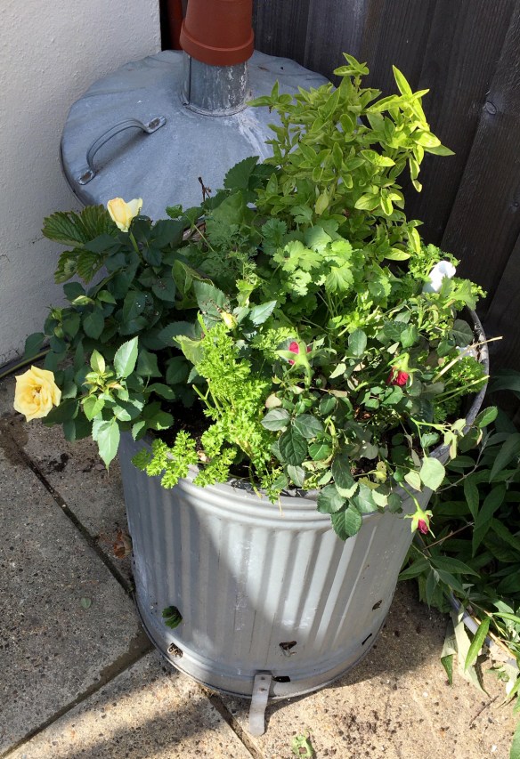 Thanks to our gardening mate Gerry Hectic for getting in touch and for letting us know about ALDI’s present gardening bargains, mini-roses at £1.79 each. The above is where Gerry put his two recent purchases into. It’s a herb infused incinerator with some coriander, parsley and is that basil or mint in there too? Inspired thinking we reckon!