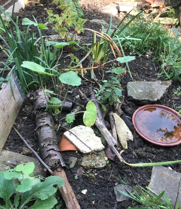 As it was very cool down there for most of the day (compared to the 32 degrees C in the sun) we just started and kept on going, taking stuff away and adding the odd different plants and herbs we have about the garden already. We reckon it will be an ongoing project as we can see a couple of plants we want to take out but we don’t want it too sparse as the wildlife needs a hiding place. There was no plan, make it up on the spot gardening innit?
