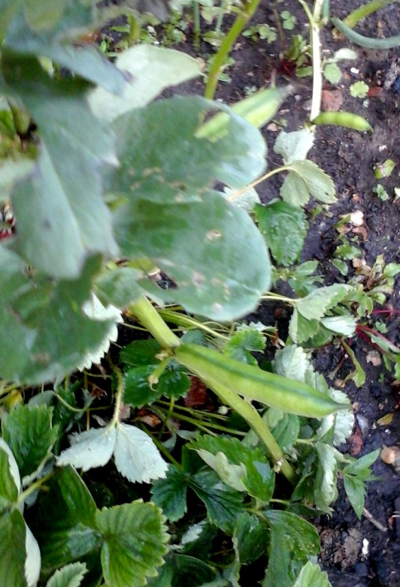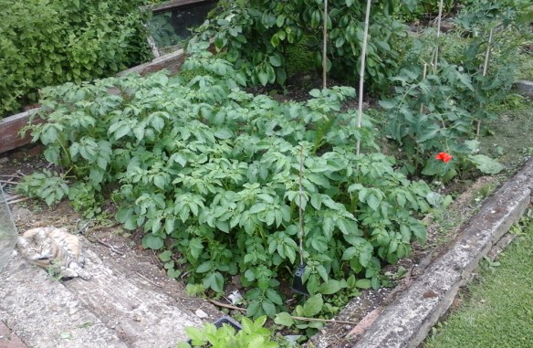 In the bed at the bottom of the garden (below) the spuds are now flowering and on the purple flowering broad beans there’s a good few pods forming. Also in that bed there’s onions, beetroot and strawberries somewhere all busy competing with each other which isn’t ideal but we’ll be pulling up the spuds in a couple of weeks so there’ll be space soon.