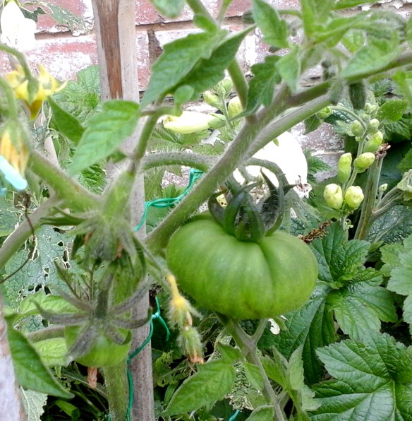The side bed (below) where once was a greenhouse is doing well too. It’s usually clayed up this time of year but earlier in the spring half a compost bin’s worth was dumped on it and around the plum tree the ash from a couple of barbecues were sprinkled around. Lots of watering and a regular bit of comfrey liquid helped too! My, look at those tomatoes…