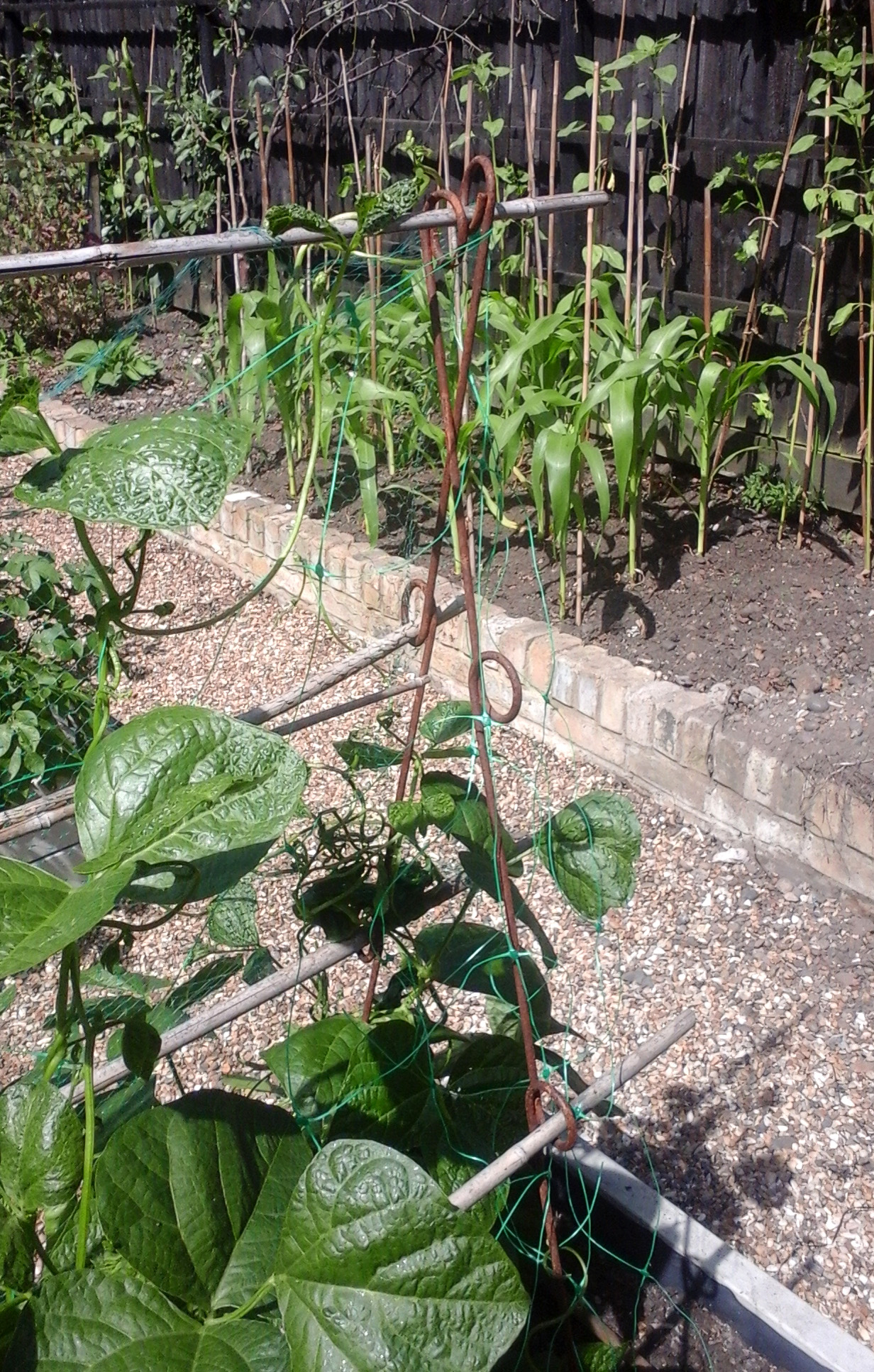 The other week we went over to an open garden event in Blackheath and had a lovely afternoon in some fantastic surroundings and even dipped a hand into our pockets at the plant sale there. While in the veg garden this bean pole idea (above) caught our eye. We very much doubt that the rusty looking metal things that are holding the bamboo canes in place have anything to do with garden centres (they’re probably something off a building site or in a steel-fixers toolkit) but we could be wrong. It’s a great idea though! If you know what they are actually are (and if you can buy them at garden centres) answers on a postcard please.