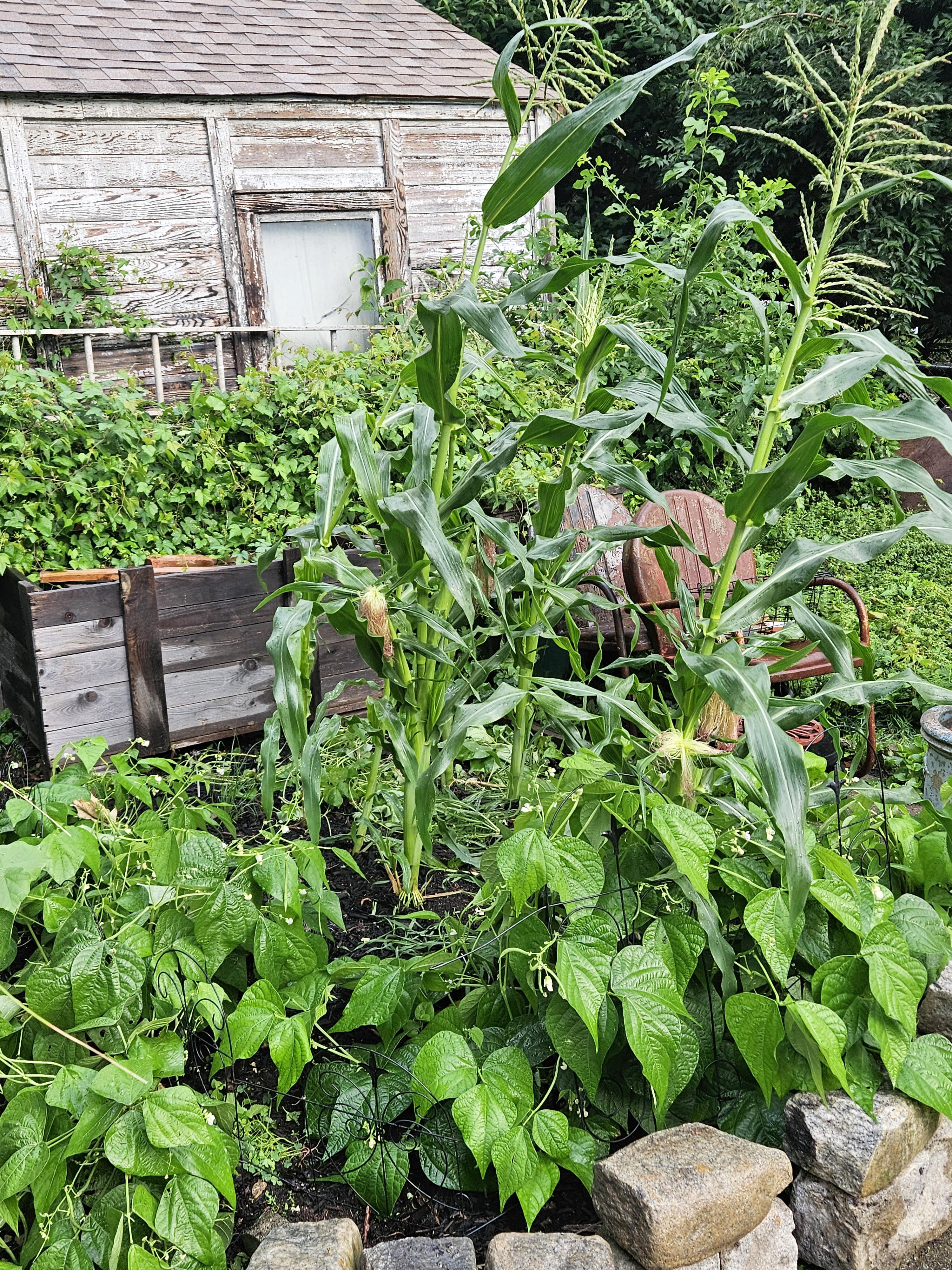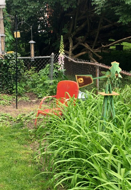 The mugwort (below) is planted on the side of the house. I try to harvest some every year around the summer solstice to make smudge sticks with. It’s good on its own, or mixed with sage & lavender in a smudge. It grows real tall and gets kind of wild. Lily of the Valley has taken over the bottom area next to old muggy, and has spread there on its own, fast, from the patch of Lily we have in the front. Blackberry bushes on the fence are also making forays into this area. Our cat Flynn is chilling on the cellar doors.