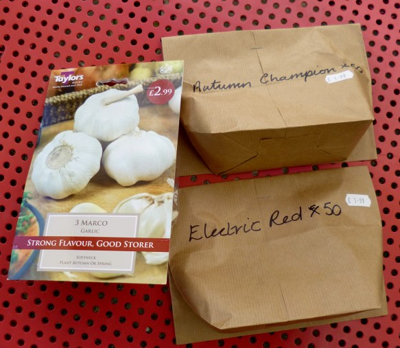 Well, we’re making a fresh start and from today logging everything plantwise we buy and also where we put it/them. This morning seen us buying some garlic, red and white onion sets to be put in for over the winter from our favourite garden centre Shannon’s. If all goes well we’ll clear some space this weekend and whack them in. You will be informed (complete with the actual date, time and location co-ordinates)!