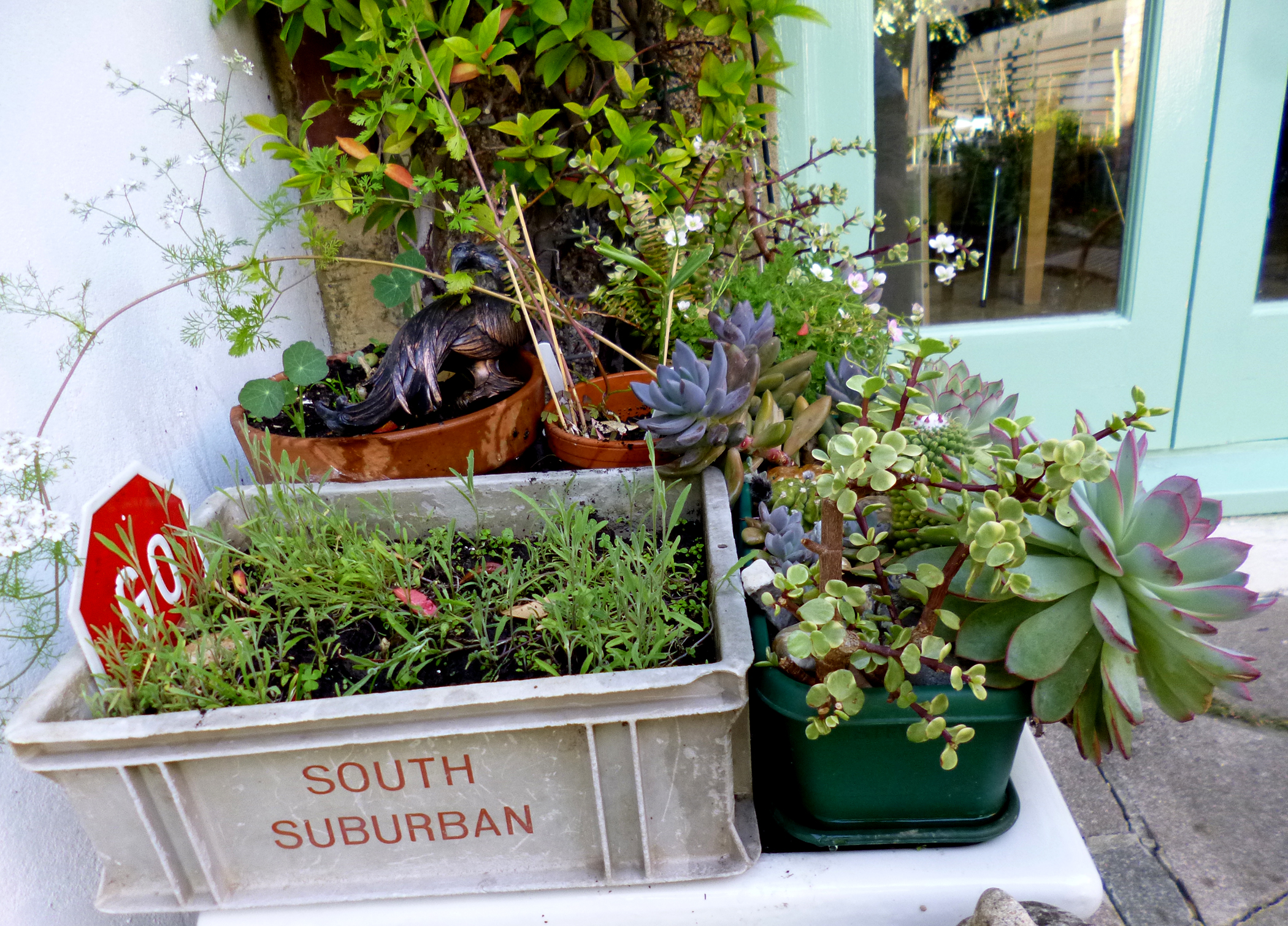 We’ve stuck the cacti and succulents outside now (below) as the weather’s on the up and loaded up the south suburban box found in the skip with night scented stock which are both on the top of an old belfast sink just outside the back door.
