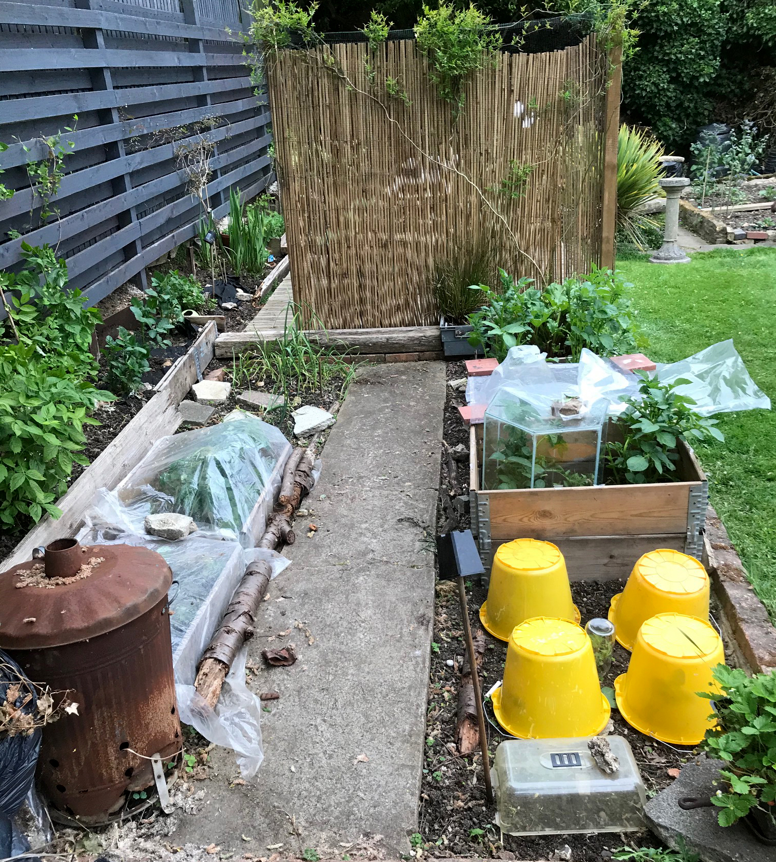 The vegetable bed at the bottom of the garden has moved on since last month. The spuds are on their way, the alderman peas are starting to grow and we’re finally seeing the runner beans germinate. And about time too!