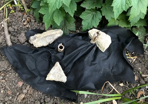 It was mainly a tidy up of the beds in front of the “Dad corner”, getting rid of the old tomato plants and whatever had self-seeded there. As you can see we’ve a new feature, (well we’ve had it for ages but it’s been hidden by self-seeded nasturtiums) part of the front wall that came down when we took out the ivy that was holding it up in the first furlough.
