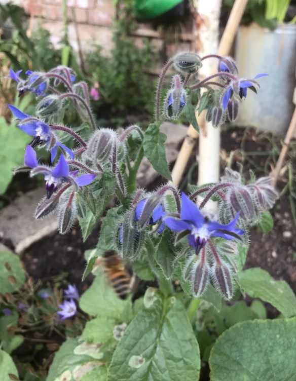 One plant we always have in the garden mainly through self seeding (thus being a volunteer plant) is the good herb borage. It’s great for the bees and its leaves can be thrown into the comfrey liquid bucket adding some extra goodness into the mix. More on its uses here.