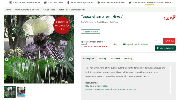 Thanks to a discount code (Thanks to Ola at Thompson & Morgan Blog!) we purchased some nice seeds from Thompson & Morgan including some nice poppies, giant sunflowers (you know we here love anything with “Giant, Weird or Rare” in the title) and also a dwarf blackberry bush which’ll be good for sticking in a pot outside the kitchen door. One plant that did interest us was the cat’s whiskers/bat plant or the devil flower (below) that looks great but as we haven’t got a greenhouse or conservatory we had to pass on it. If you have somewhere under glass where it can go, go get this plant!