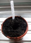 The first thing I did before filling my pots was to place a piece of broken crock or porous stone (small pieces of broken terracotta plant pots are ideal) over the top of the drainage holes. Then I filled it with the compost and lightly firmed it down. Give the pot a water if the compost isn’t moist already and drain it off. Make a small hole in the centre with your finger where the seedling will go. If the compost was kept outside in the cold the night before, make sure it’s well thawed out before using.