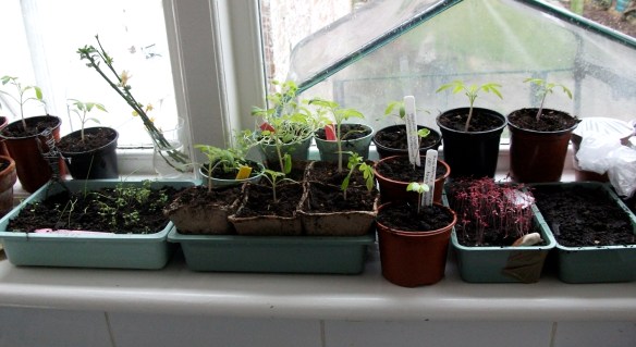 Where has that sun gone to, the one that appeared here the weekend and the same one that contributed to Sunday being 17°C? You will laugh, as over the weekend we even put some plants out in the back garden to harden off. It’s only March and we’re thinking about hardening off plants, we must be crazy. The above pic is a of self-seeded tomato in front of some suncream, after sun and insect repellent, a taste of things to come you reckon?