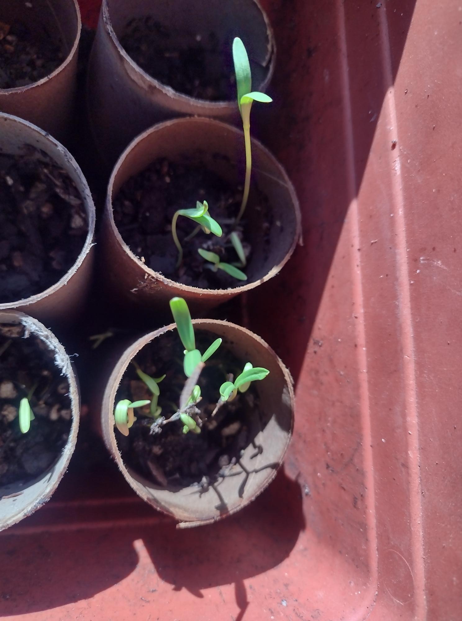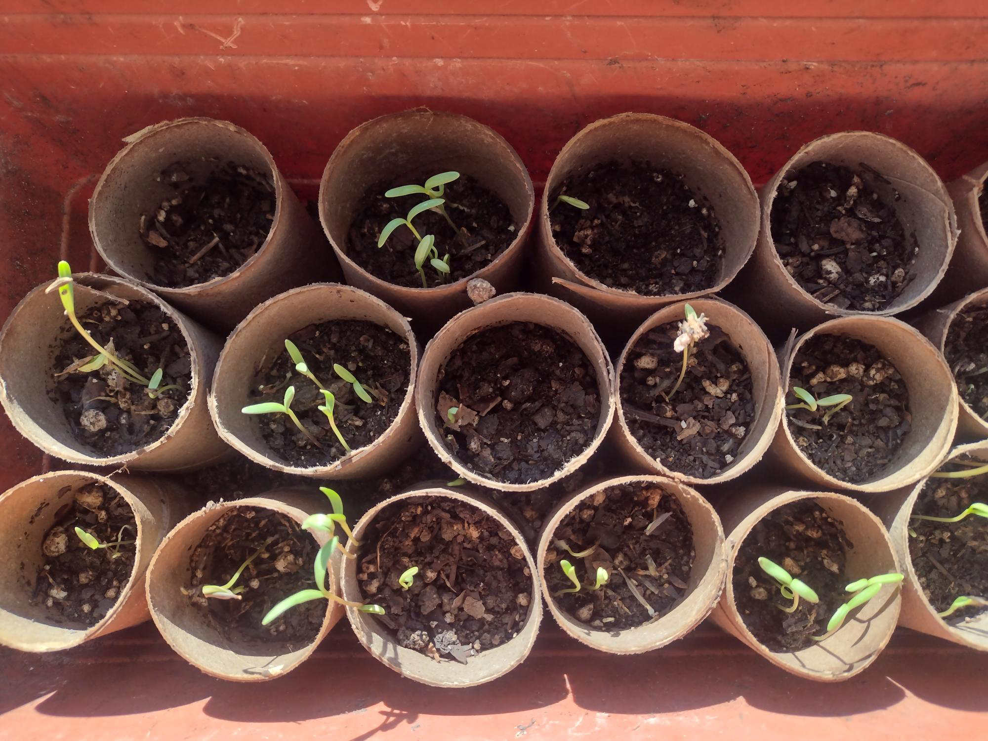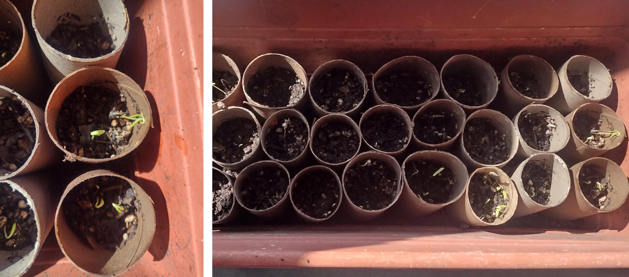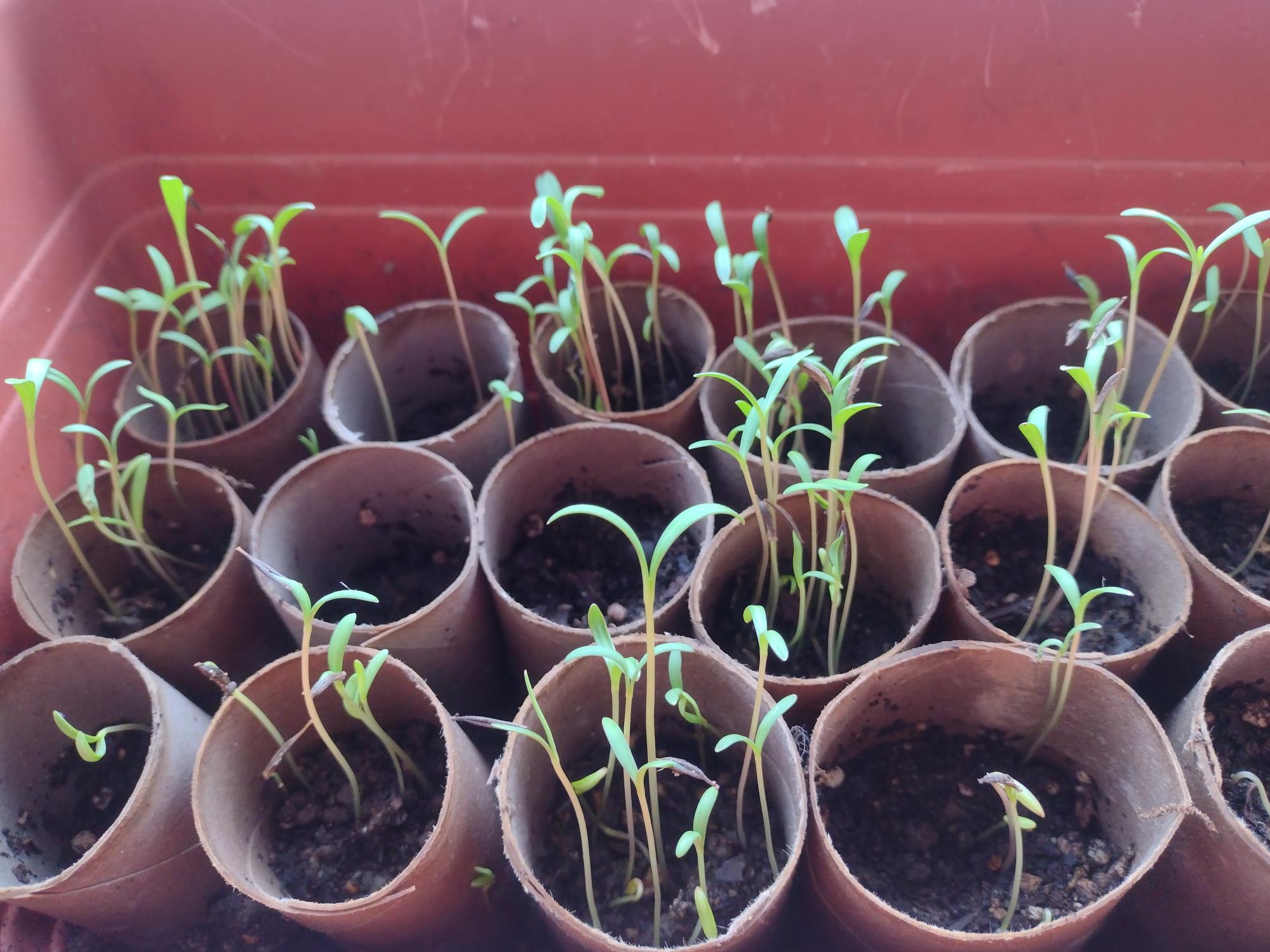 She also sent some useful information about the seedlings that we didn’t know “…cosmos plants have long roots, even when they are small, so egg-boxes didn’t work well last year. This time, I have tried to use the cardboard insides of toilet rolls. I put these in a plastic trug planter thingy to keep them upright and stable.”