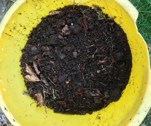 We got some bricks to make a simple support to put the frame on and then dug out a good bit of soil out of the space within, then made a small compost trench with a little bit of kitchen waste pinched from the top of the compost heap (whilst we were there, we gave the heap a bit of a fork over and a mix). Also using a trowel, we fished out about two buckets worth of decent compost (Black Gold as they call it) from the bottom of the heap which we put on top of the compost trench and then covered that with the soil we initially took out and there you go, we’ve now got some shallots “under glass”!