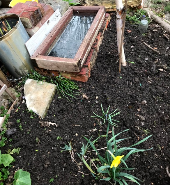 The plants in the raised beds with protection are starting to get going. There’s onions, shallots, chillies, spuds and tomatoes. Can we stick anything else in them? The old window frame we found in a skip donkey’s years ago has some cabbage seeds which have’t germinated yet. And in the foreground remains of the front garden wall that was stripped of its ivy (that was actually holding it up!)