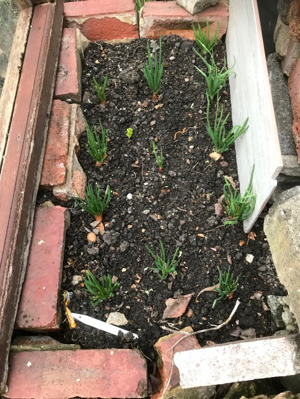 The shallots we put in a couple of weeks ago “under glass” (which is just an old window frame found in the street balanced on some house bricks) are off to a flying start. We’ve tried growing shallots before but they rotted even before they got this far so we must be doing something right this time.
