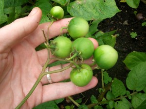 And here’s an oddity (pic below) from one of our raised beds. The lime green fruit towards the top of the pic is a tomato. The dark green one towards the bottom, just behind the poppy bud is the fruit of a potato. Eat that and you’ll regret it!