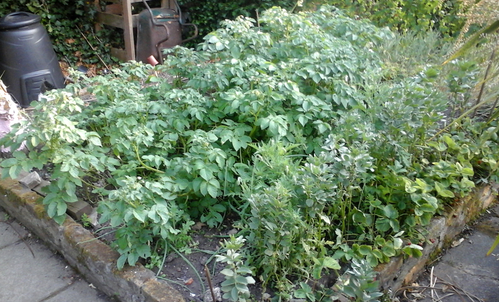 The side bed (below) where once was a greenhouse is doing well too. It’s usually clayed up this time of year but earlier in the spring half a compost bin’s worth was dumped on it and around the plum tree the ash from a couple of barbecues were sprinkled around. Lots of watering and a regular bit of comfrey liquid helped too! My, look at those tomatoes…