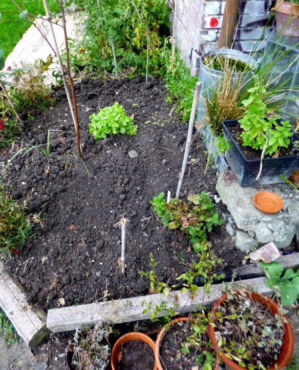 The onions sets we got too were put in today (when it didn’t rain) by the silver birch and the lone lettuce from the Thomson and Morgan seed trials. On the left is the Autumn Champion and Electric Red on the right. Apart from putting those in, it was just a little bit of tipping around and the odd bit of weeding. At least we know where we’ve put stuff now!