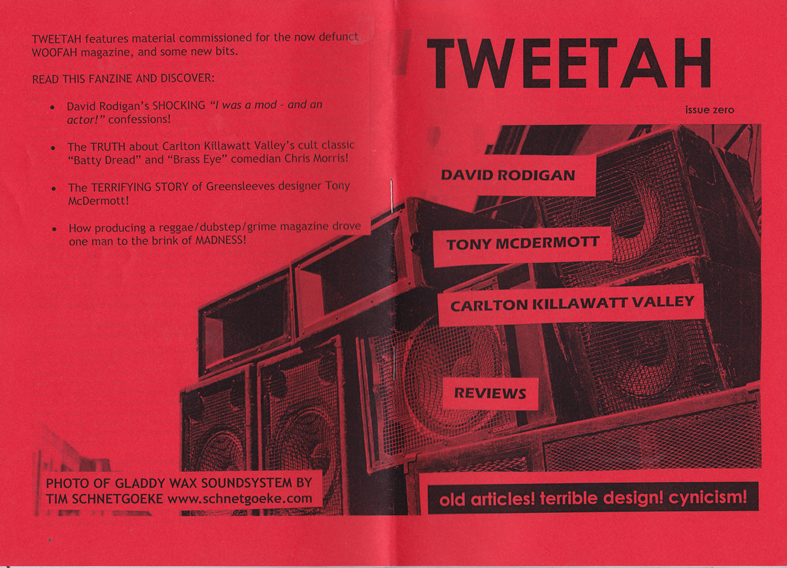 Last week on John’s Uncarved blog I noticed he was selling a fanzine called Tweetah. This is material that was intended for the fifth and final issue of Woofah that never materialised, bah! It’s a great little read, has an interview with David Rodigan, Carlton “Killawatt” Valley and a piece on Tony McDermott, designer of classic greensleeves album covers (Scientist, Lone Ranger etc) amongst other stuff. RIP Woofah! An excellent read for only £1.50 from http://www.uncarved.org/blog/